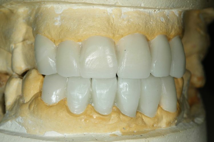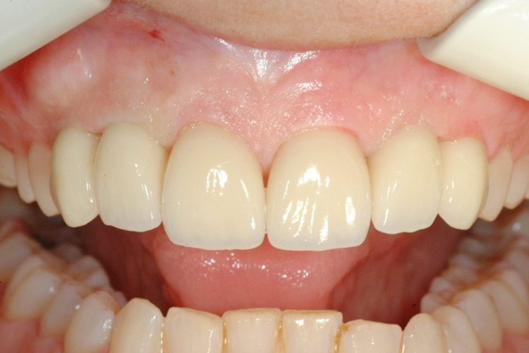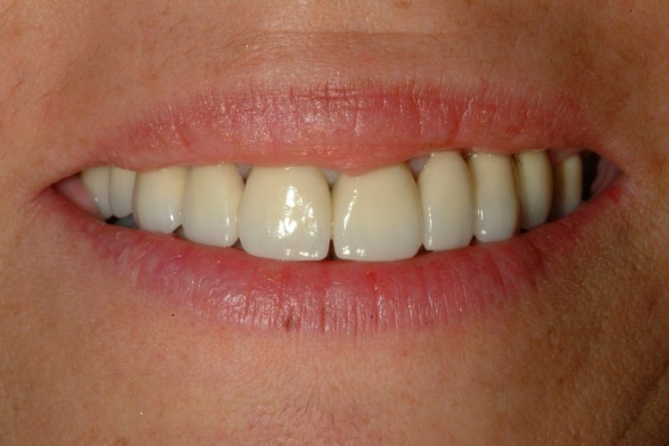 Caso Clínico: Ponte metalo-cerâmica com 10 elementos sobre dentes e implantes em paciente com perda de 6 dentes no maxilar superior Descrição: Paciente com 50 anos com perda de 6 dentes no maxilar superior descontente com a prótese removível que possui e com uma com aparência estética desfavorável que pretende uma reabilitação fixa funcional e uma