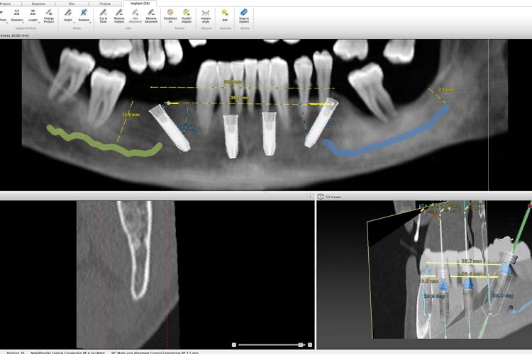 Caso Clínico: Reabilitação total bimaxilar com 10 implantes e 2 próteses híbridas Descrição: Paciente com 65 anos residente em Macau que pretende uma reabilitação total com implantes no prazo máximo de 8 meses. O tratamento constituíu na extração de todas as peças dentárias, colocação de 6 implantes no maxilar superior e 4 no maxilar inferior culminando